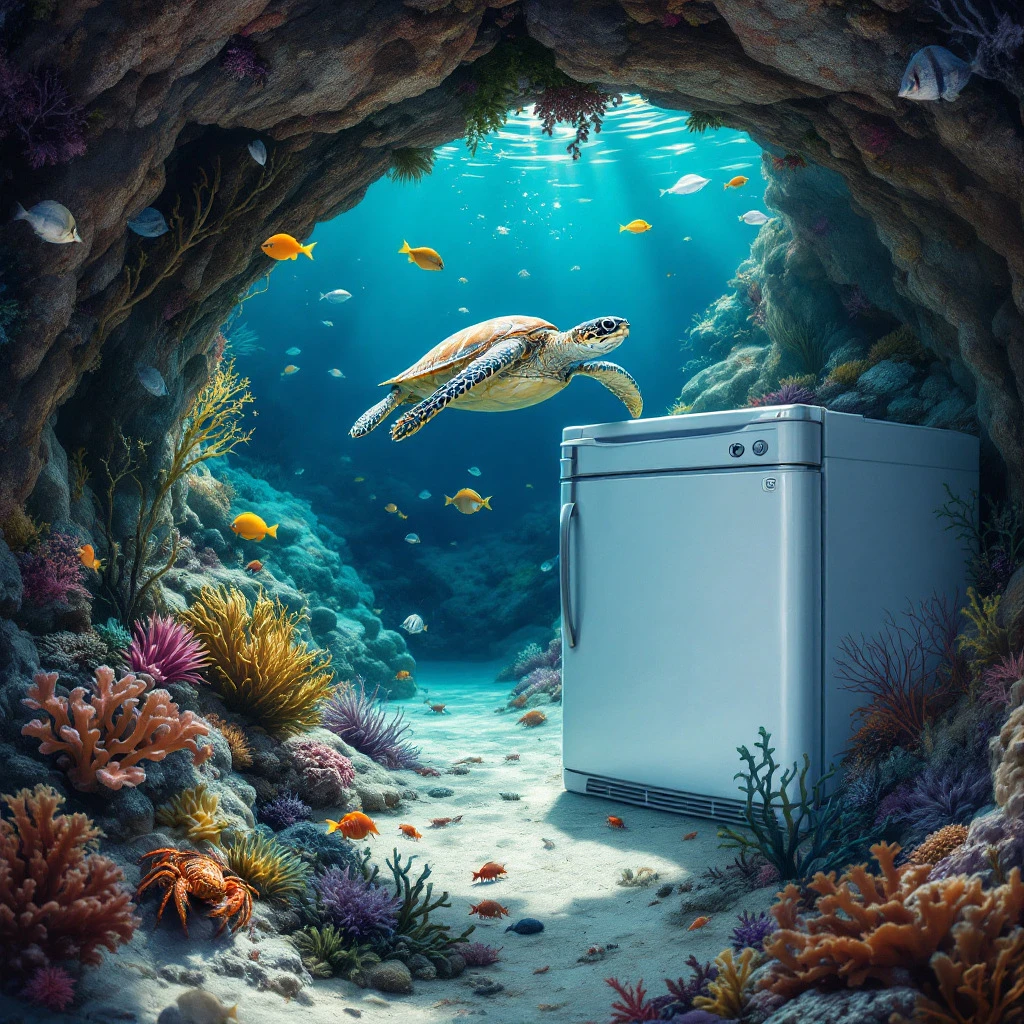 Create an underwater scene featuring a sea turtle swimming on top of a refrigerator, looking down with curiosity. The marine life around is abundant, with a large moray eel hiding in a hole, and a lobster hiding in another spot. Small shrimp are sitting on the rocks, alongside vibrant marine sea fans and corals. The background should capture the vivid colors and diversity of an underwater ecosystem, with various fish swimming around and sunlight filtering through the water.