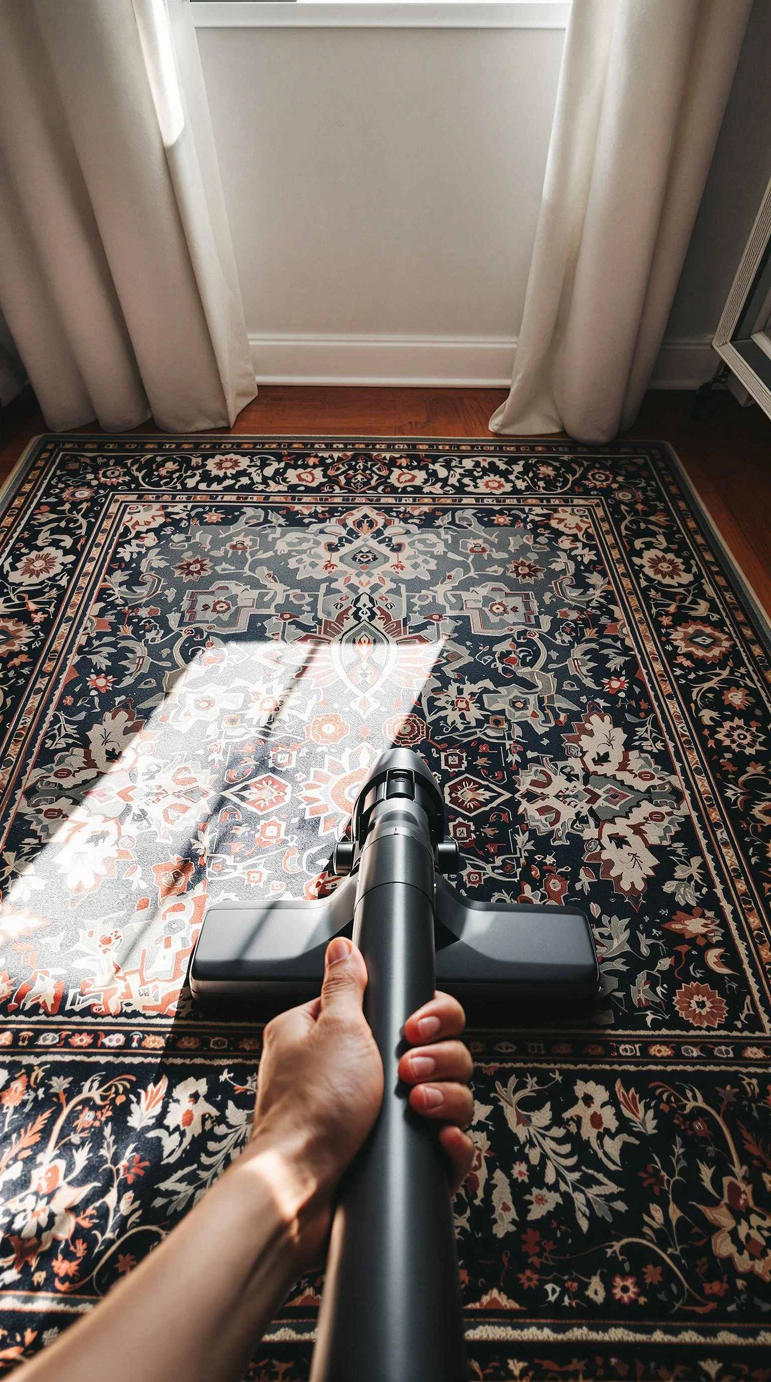 POV first-person, I am vacuuming the floor in my small, minimalist home. The camera captures my first-person perspective, showing only my hands gripping the vacuum cleaner's handle as I push it across the traditional Persian rug. The intricate patterns of the rug are visible beneath the vacuum, with the fibers slightly moving as I clean. The lighting in the room is natural, coming from a nearby window, casting soft shadows on the floor. The background is slightly blurred, keeping the focus on my hands and the vacuum cleaner in action. The scene feels realistic and natural, emphasizing the everyday task of cleaning.