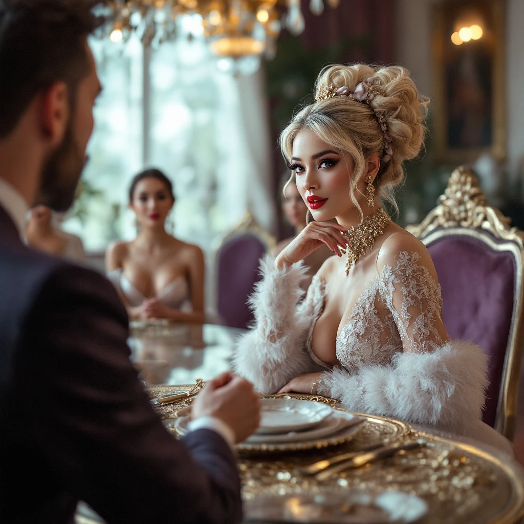 cinematic shot, glamorous rich alluring Asian beautifully and brightly dressed in opulent white lace fur purple gold satin as party girl sitting at an ornate table intently watching another guest in a beautiful white palace living room, exquisite blonde hairstyle, cascading curls, bouffant, satin ribbons, exquisite makeup, bright red lipstick, mouth open, beautiful hands, beautiful interested ladies watching