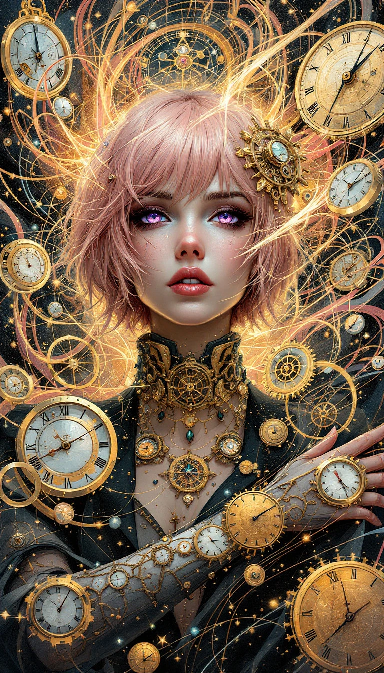 "Rose Gold Chronomancer in a Time Stream": A mesmerizing abstract painting depicts a chronomancer, exuding both intellect and a touch of the arcane. She is a skilled manipulator of time, depicted amidst a vortex of swirling clocks, gears, and temporal energies, with fair features, short, rose-gold hair that seems to shimmer with embedded crystals, and a layered, practical outfit with mechanical accents. Timepieces and various tools adorn her hands and arms. The artwork masterfully combines modern abstraction with a figure portrayal, creating a dynamic and mesmerizing scene, with a palette of golds, silvers, and rose tones. Her focused, violet eyes, the focal point of the composition, convey both sharp intelligence and a deep understanding of time itself. After a long night spent manipulating the flow of time, the chronomancer embodies precision and a powerful sense of responsibility. The intricate details and dynamic energy invite the viewer to explore the hidden narratives within this vibrant artwork, rendered as a painting.