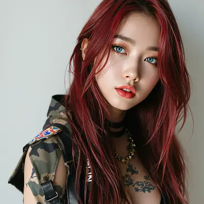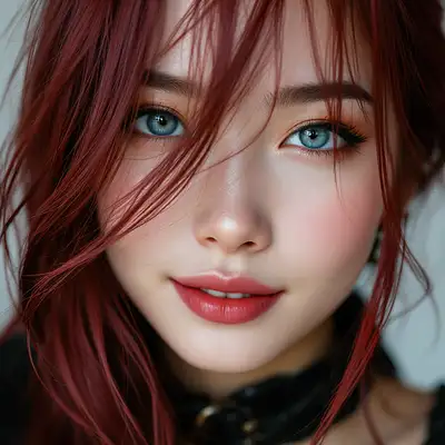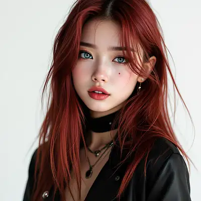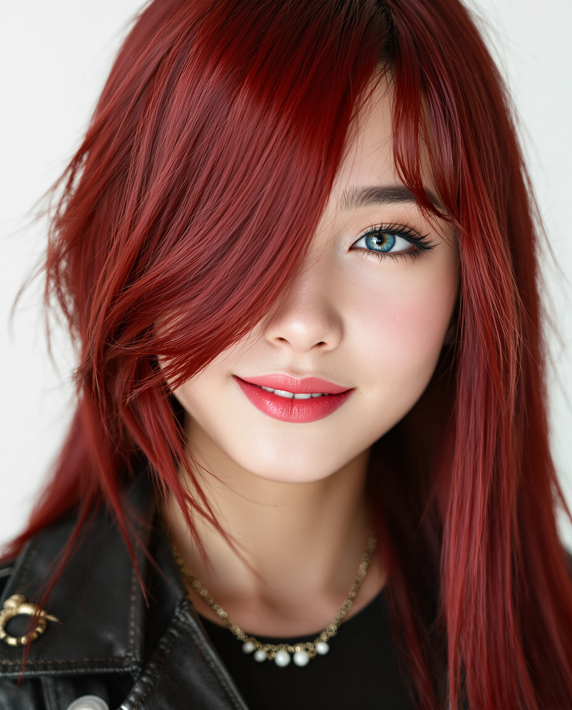 A photorealistic portrait of an 18-year-old Indonesian-Korean girl smiling gently at the camera, with long, sleek red maroon hair partially covering one of her striking blue eyes, and a pale complexion adorned by a mole beneath her eye. Her attire reflects a bold rock fashion style, harmonizing with the simplicity of a white background. The composition focuses on her upper body, with intricate details and textures highlighted, portraying her vibrant personality under bright, even lighting