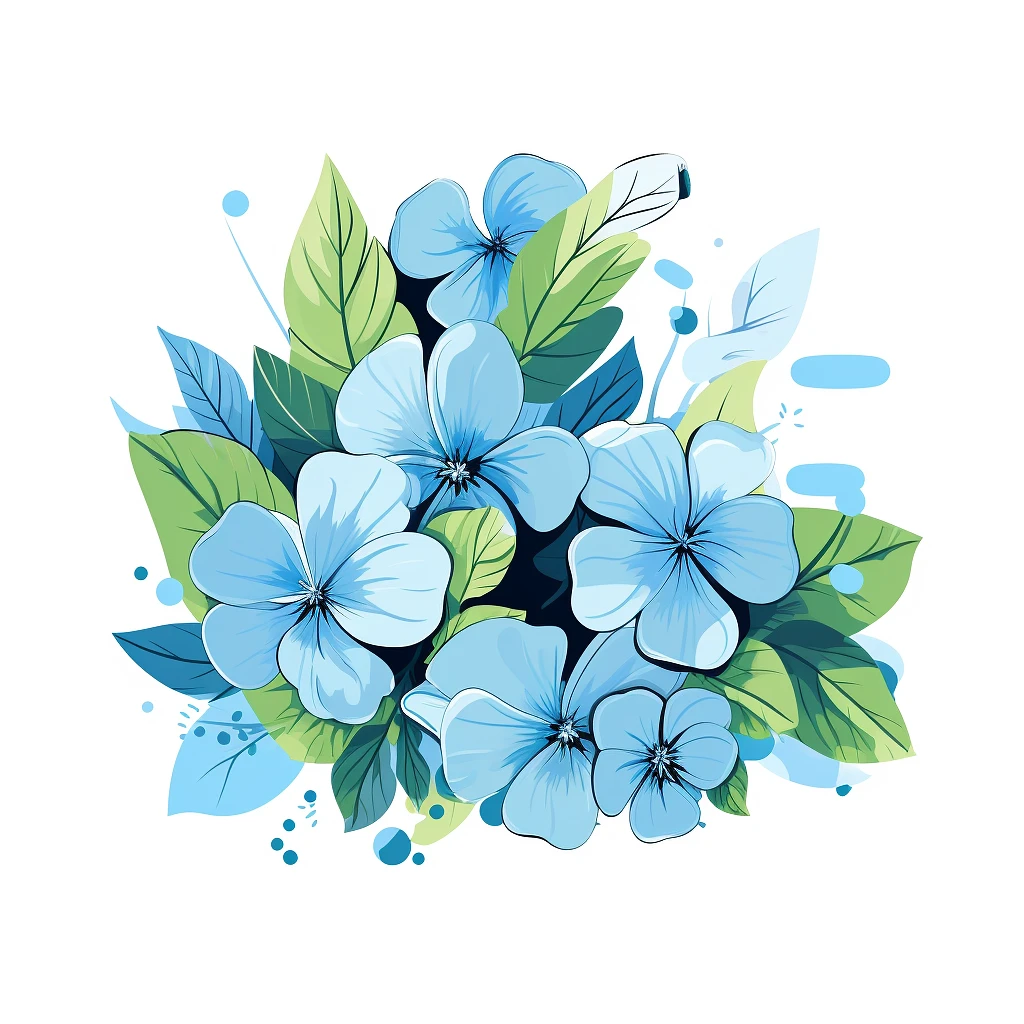 Blue flowers and green leaves, svg vector vibrant flat, watercolor style, art by Carlos Cruz-Diez, tshirt illustration, light blue background --v 5. 2