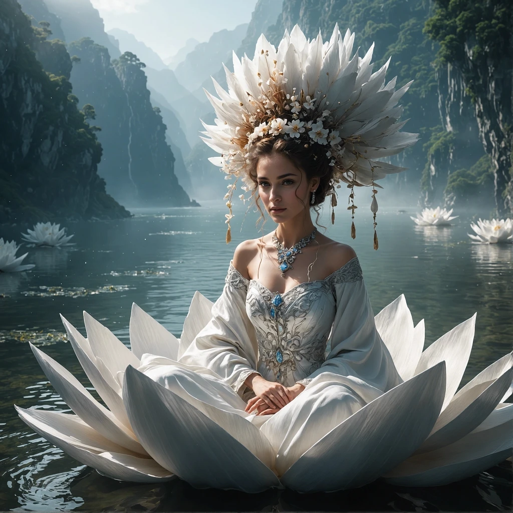 In this portrait, Yemoja is shown in her Lotus Crown skin, seated on a lotus flower in the middle of a tranquil pond. The environment around her is peaceful and serene, with a gentle breeze rustling the leaves of the surrounding trees. Yemoja herself is dressed in flowing white robes, and her hair is styled into an elaborate updo adorned with lotus flowers. The use of advanced 3D modeling and texturing techniques, combined with volumetric lighting and particle effects