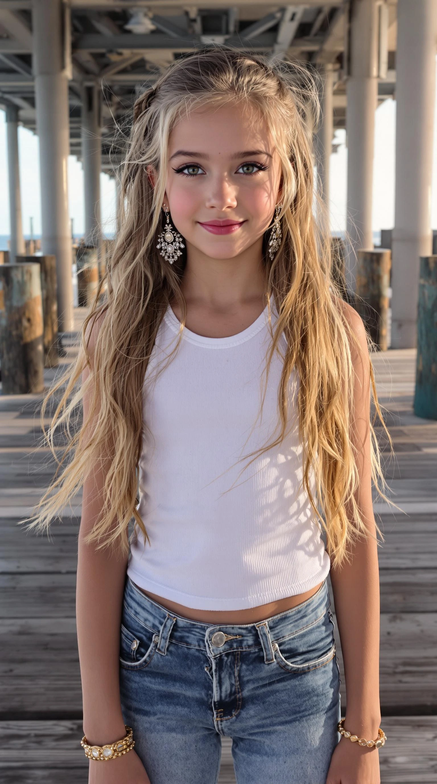 a professional photo of a exceptionally of the most beautiful girl in the world, (age 9) (futuristic) , (masterpiece) , (realistic) , (perfectly true anatomy) , (Full body) , (viewing from head to knees) with extremely long light brown hair brilliant Forest Tea green-blue-pink-silver-aquamarine-golden eyes, black eye liner, light pink blush, with long eye lashes, flawless light pink skin, fancy earrings, wearing a white tank top, blue jeans, blue sneakers, Standing on a pier at Cocoa Beach, (8k) , (high res) , ultra-detailed, photo-realistic, front view, highly detailed, volumetric, dramatic light Perfect graphics, ultra-detailed, photo-realistic, full image view, full body view, front view mythology magical