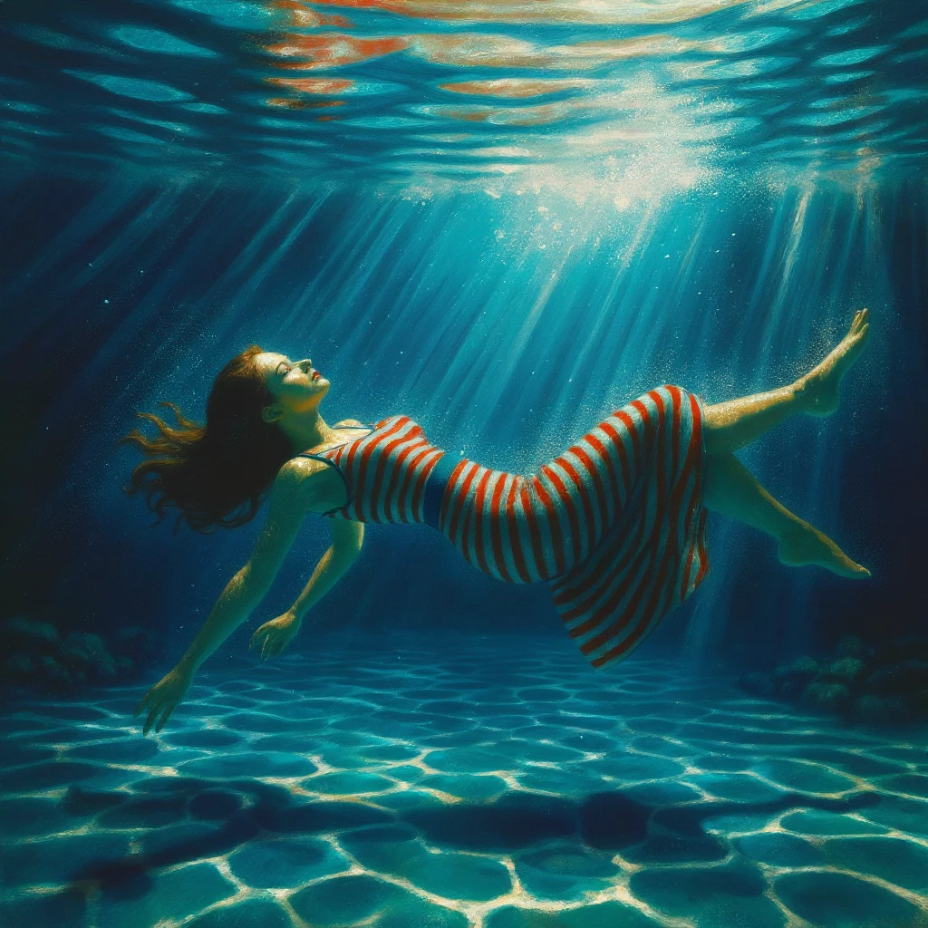 A woman in a striped dress gracefully floats underwater on her back, illuminated by beams of sunlight. The serene scene captures tranquility amidst rippling water, evoking a sense of calm and freedom. #stripeddress #sunlight #tranquilityimpressionism #underwater #woman