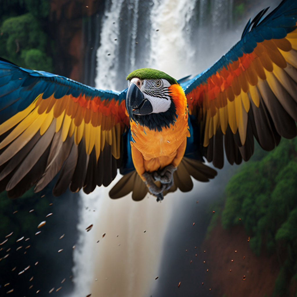 Midjourney prompt: A macaw flying over the Iguazu Falls in the Amazon...