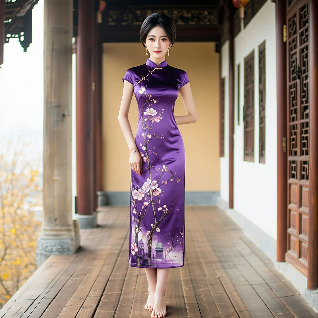 (((full body view) )) (masterpiece, best quality, highres:1.2) , (intricate and beautiful:1.2) , (detailed light:1.2) , (colorful, dynamic angle) , (full body shot:1.3) , cute face, model, portrait of an asian beauty, short hair, messy hair, bob cut hair, intense black hair, extremely detailed eyes, beautiful colored eyes, fit body, violet chinese cheongsam, barefoot , hair ornament, jewelry, wood floor, (cinematic) , (more details:1.3)