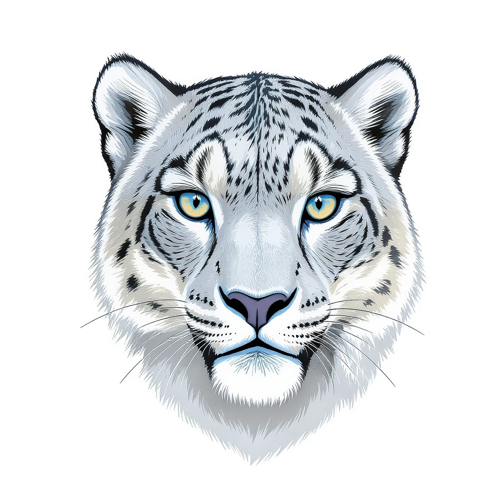 Illustration of a snow leopard's head, white background, vector art, print style, bold lines, dark grey and light blue colour palette, hyper-realistic details, flat design, high resolution, high contrast, detailed face with sharp edges and clear outlines, in the style of a realistic wildlife illustration. --ar 2:3