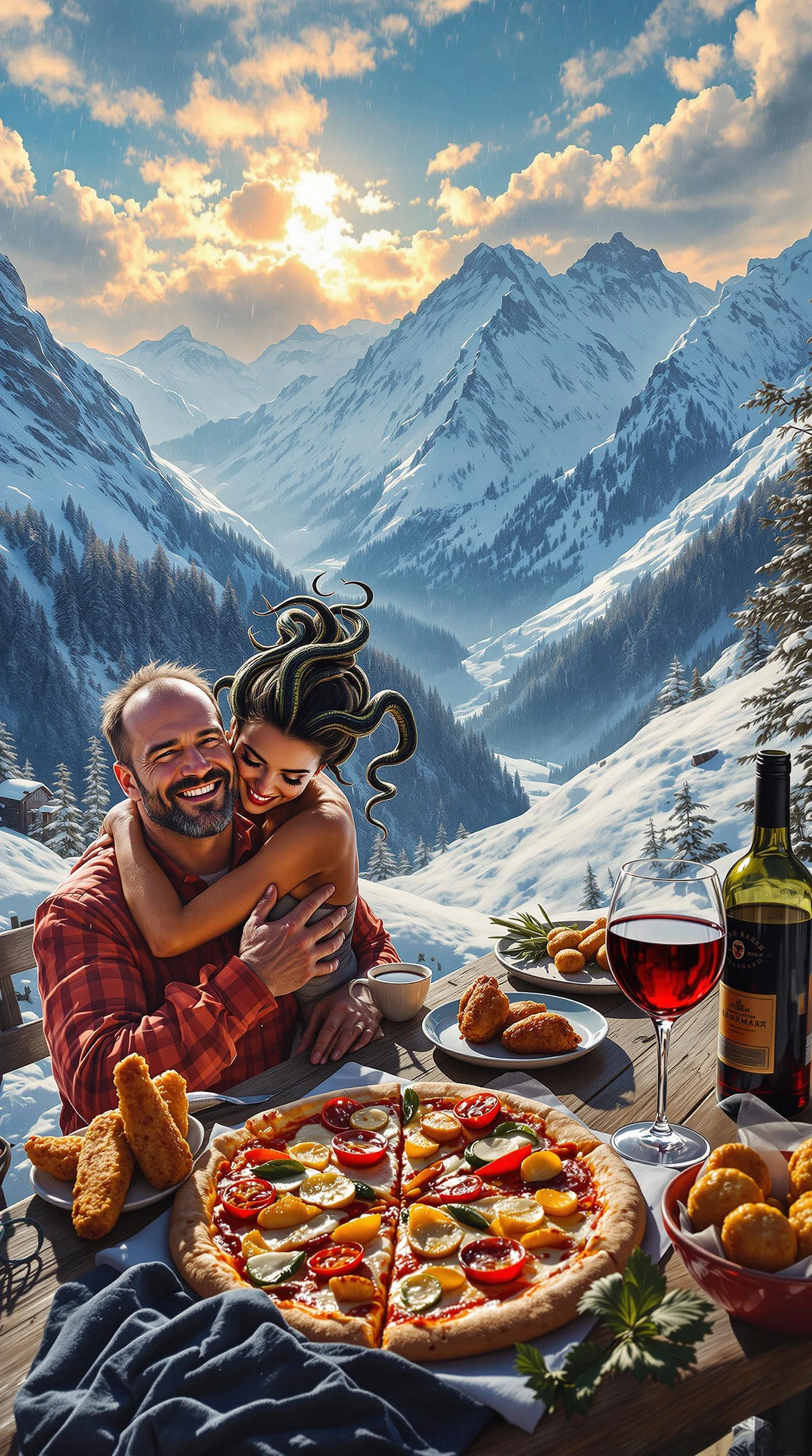 Photorealistic oil painting by Austrian songwriter RIAN, fantasy weekend diary collage, POC Medusa-inspired social media it-girl with snake hair embracing retiring husband Klaus Burowski in Taka-Tuka country. Die Hard movie influence, Morena Baccarin and Bruce Willis aesthetic. South Tirol alpine landscape with snow, sun breaking through rain clouds, winter scenery. Italian pizza, burgundy red wine, chicken wings, hiking gear, steaming indoor pool and cedar sauna. Ultra high density details, sharp focus on subjects with bokeh background, magazine-quality commercial photography. Vivid colors: cool blues of alps, warm reds of wine, golden sunlight, rich earth tones. Realistic textures of skin, fabric, water and food. No extra limbs or deformities, perfectly proportioned human figures.