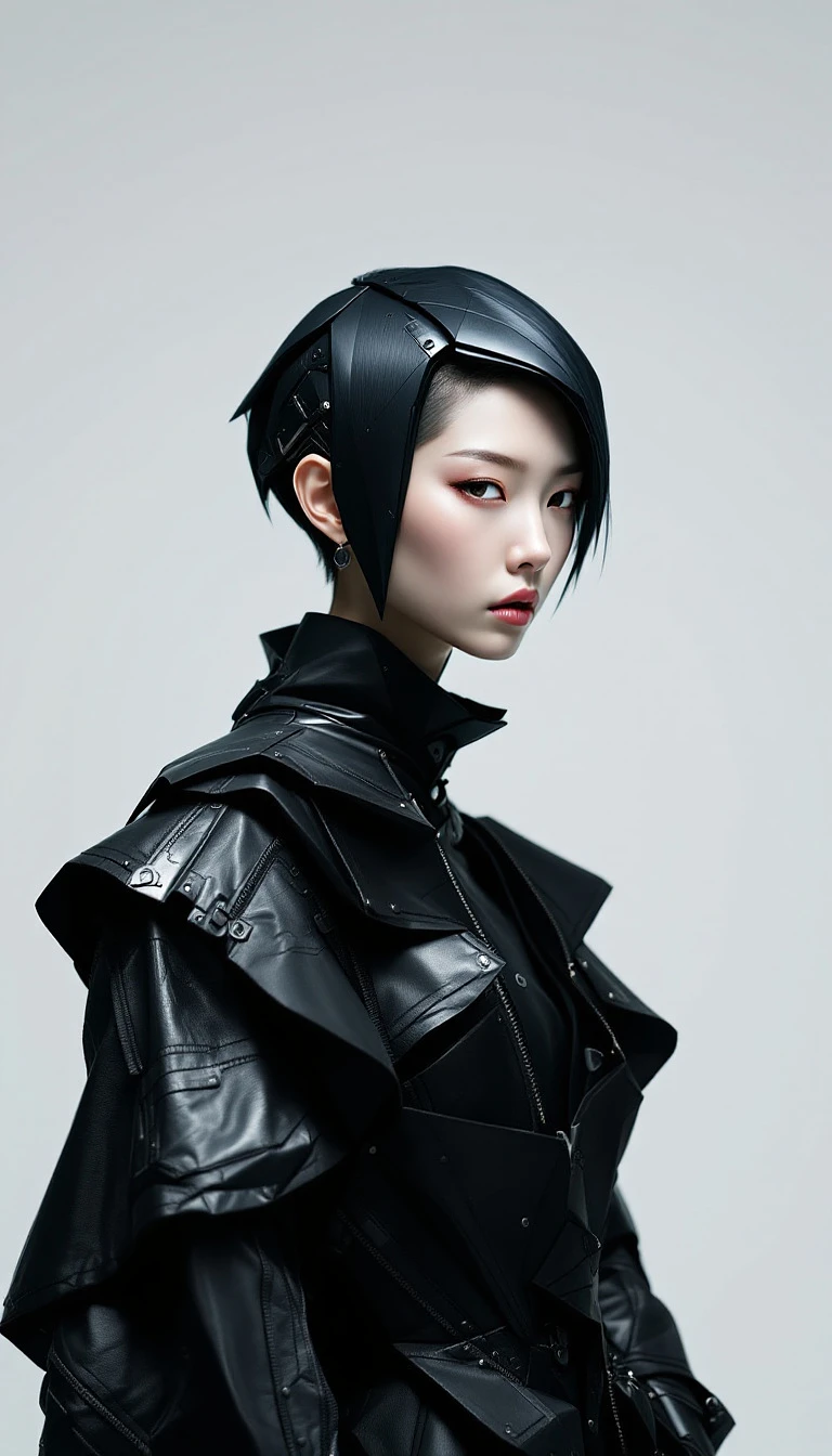A captivating and hyperrealistic portrait of a cutting-edge Japanese woman. She stands against a minimalist background, her unique style and fashion taking center stage. She wears a futuristic, layered outfit in shades of black and silver, with unexpected asymmetrical cuts and details. Her bold, geometric haircut and delicate facial features create a striking contrast. The image has a strong cyberpunk influence, with echoes of surrealism and abstract art. The focus on textures and precise details creates an immersive, almost otherworldly experience.