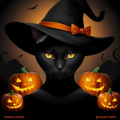 black cat inside a pumpkin, green eyes, cute look, charming and adorable look, halloween style, background with witches on broomsticks flying through the air,