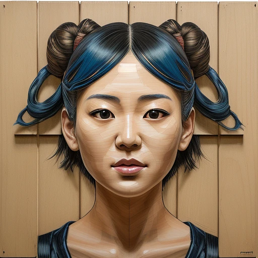 a japanese woman's face made from wooden boards, in the style of tim okamura, abstraction-création, 32k uhd, andrew atroshenko, minjae lee, dark beige and blue, modular --ar 25:36 --stylize 750 --v 5. 2