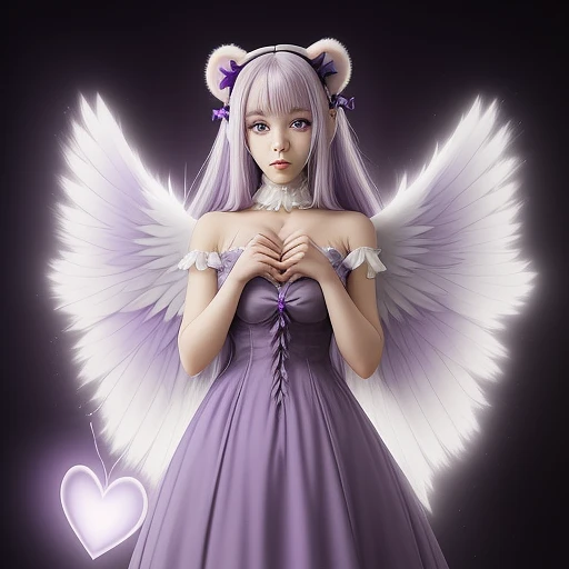 A beautiful mesmerizing anime woman that is biracial. With white and purple hair. She has teddy bear ears and light lilac-colored wings holding a pillow shaped like a heart she is in a really beautiful dark purple dress and she is standing.