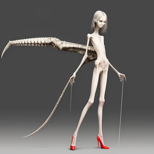 a needle-thin anorexic girl with skinny long legs and long skinny calves in high heels with long hooked claws, naked