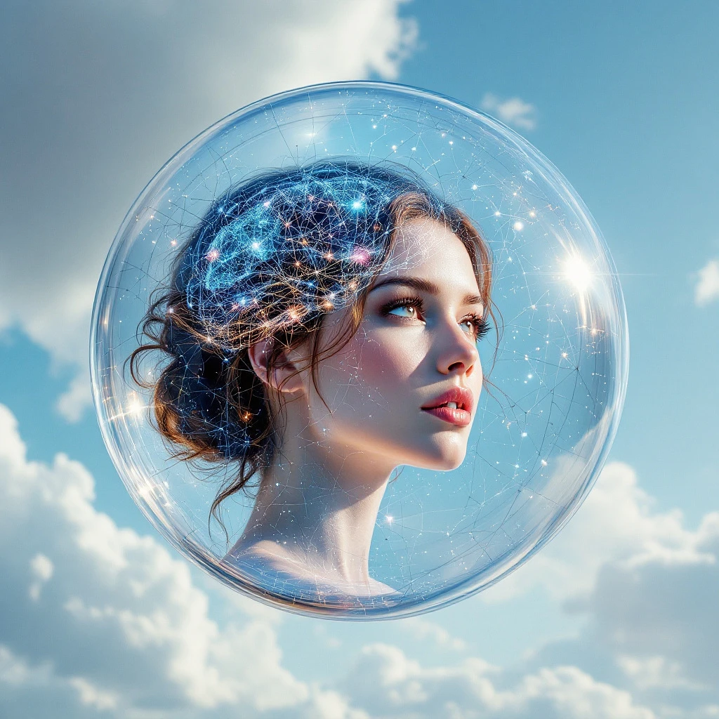 A stunning beautiful woman inside a giant hovering glass sphere. Background within the spere is a brain that got overloaded with a neuronal network. Backround outside the sphere is a blue calm sky with some soft white clouds and angles