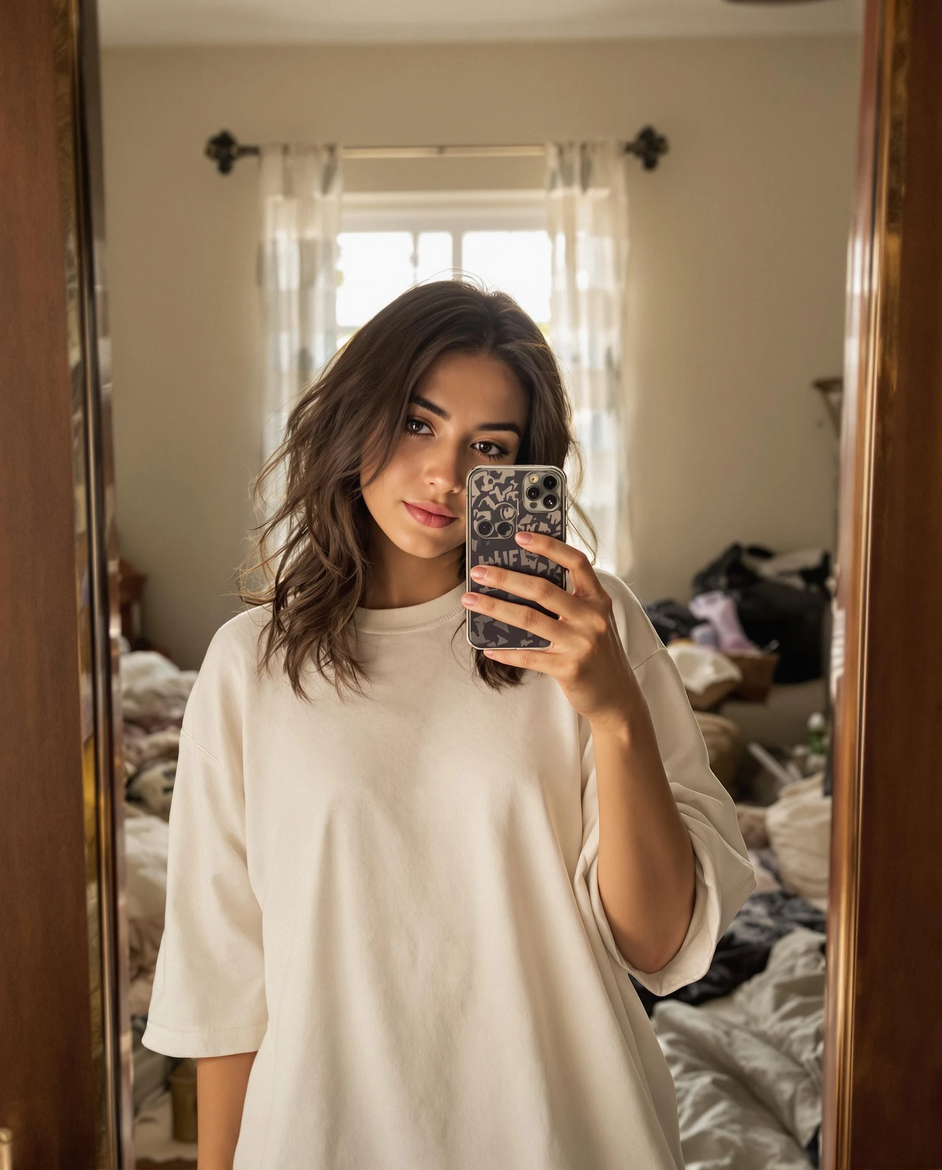 A highly detailed, ultra-realistic portrait of a 22-year-old young brunette woman taking a mirror selfie in the early morning. She holds an iPhone with slightly grainy camera quality, capturing a well-balanced view of her full reflection. Her deep brown eyes, still carrying a hint of drowsiness, focus on the screen with a soft, natural expression. Her soft, wavy dark brown hair falls slightly tousled, framing her face in effortless morning beauty. She wears an oversized thigh-length T-shirt, draping loosely over her form, exuding a cozy, relaxed vibe. The warm, natural morning light filters through the room, casting a soft glow on her smooth, makeup-free skin. The background is softly blurred, revealing a cozy, slightly messy bedroom with subtle details like an unmade bed and a window with sheer curtains letting in diffused sunlight. The mirror captures her full proportions accurately, ensuring a natural and elegant look. The slight grain and unpolished iPhone camera effect add to the raw, unfiltered aesthetic, creating a stylishly effortless appeal.