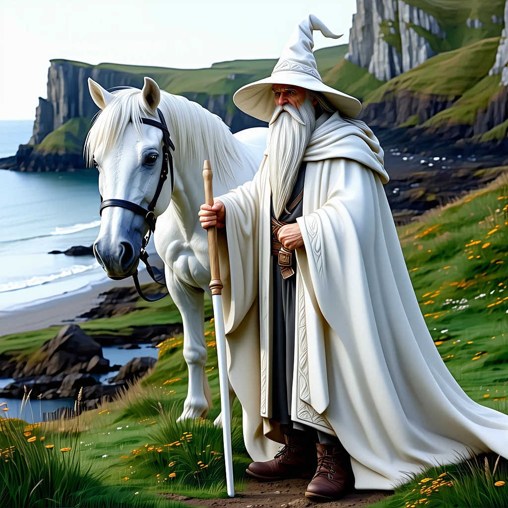 ultra realistic, 35mm, image of a large 3D, The Lord of The Rings Gandalf, wearing his signature white robe and white wizards hat holding his white wooden and marble wizard staff, standing near a beautiful white wild horse, with the White Cliffs of Dover in the epic background, 16k UHD highlight the details