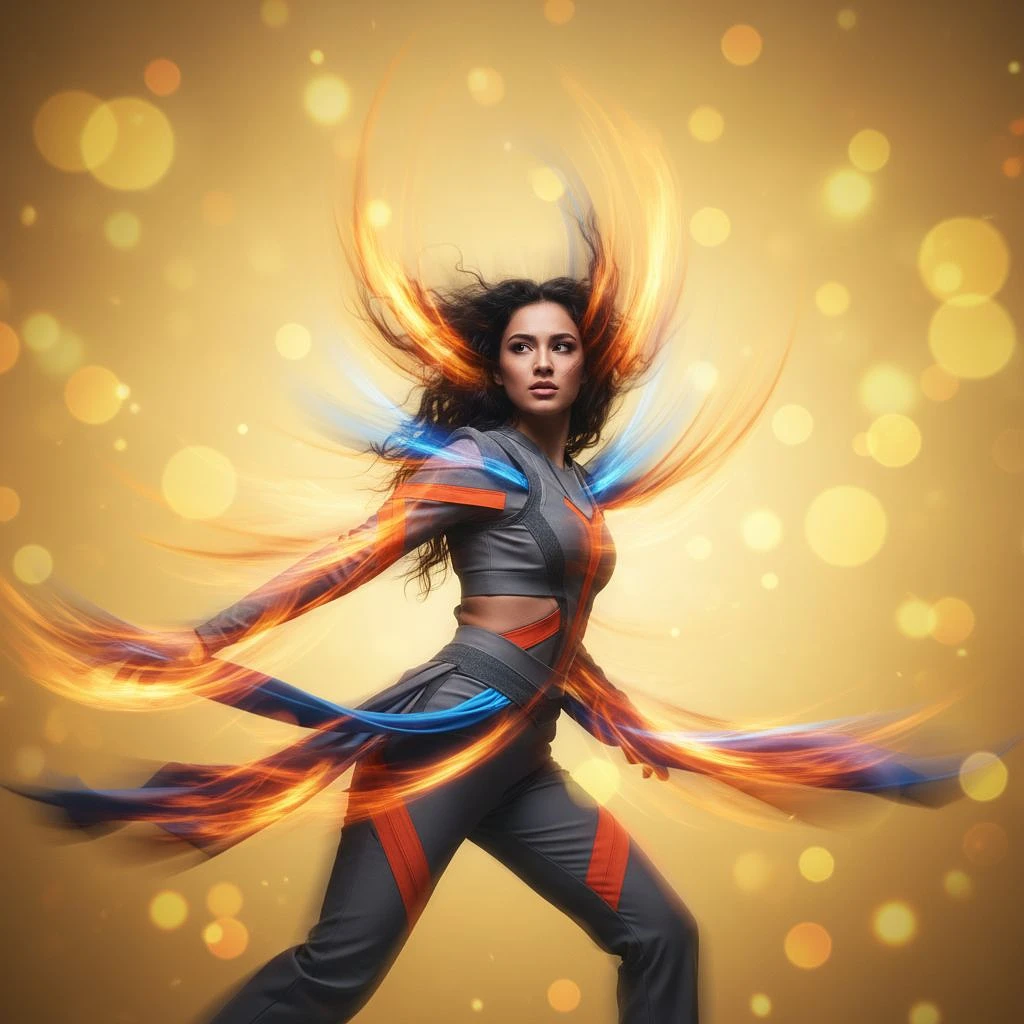 photography, dynamic portrait of a woman, vibrant orange and deep blue motion blur effects, movement and powerful energy, vivid yellow background that enhances the perception of speed, bokeh effect, ultra realistic, 16K, rich detailing --ar 9:16 --style raw