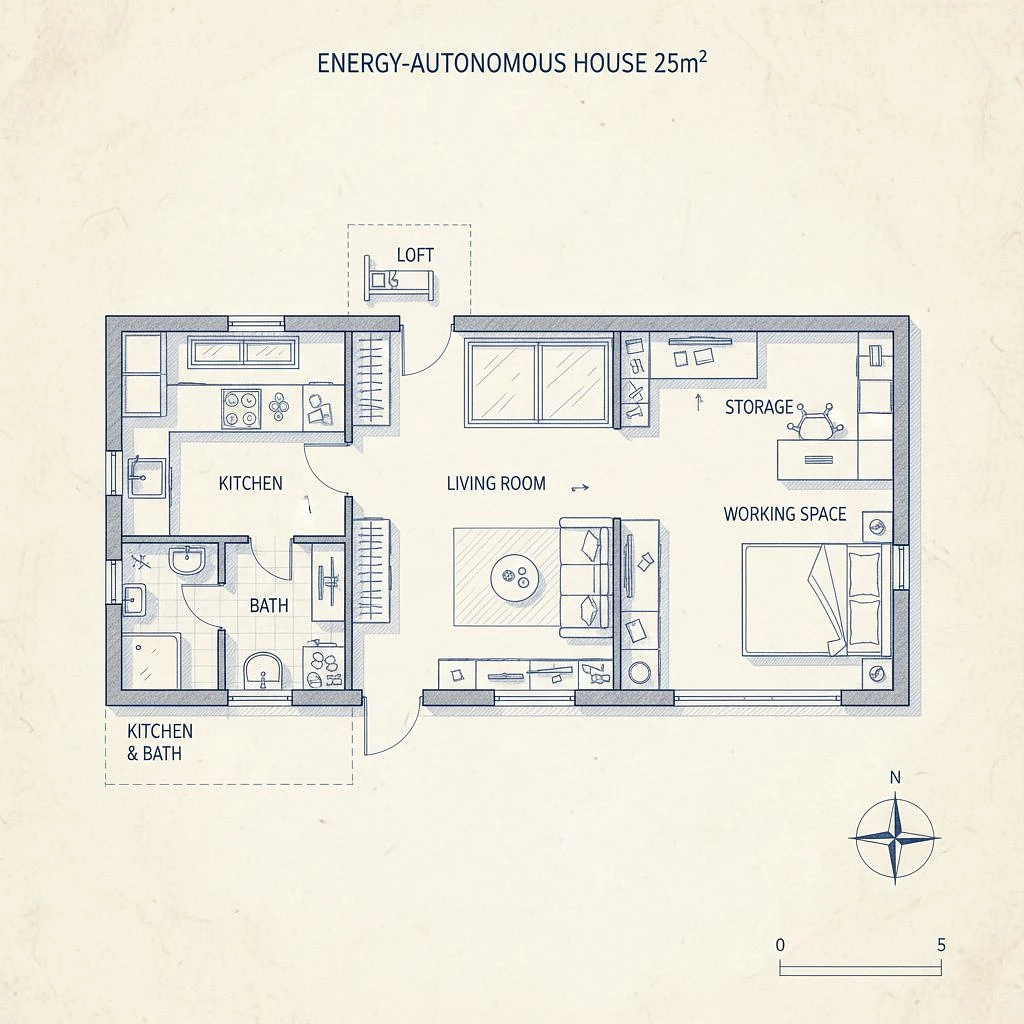 The plan of a small energy autonomous house 25m². Place kitchen and bathroom as a protrusion on the left. The other spaces will be livingroom, bedroom, and a working space for a young couple. Open spaces, storage, loft.