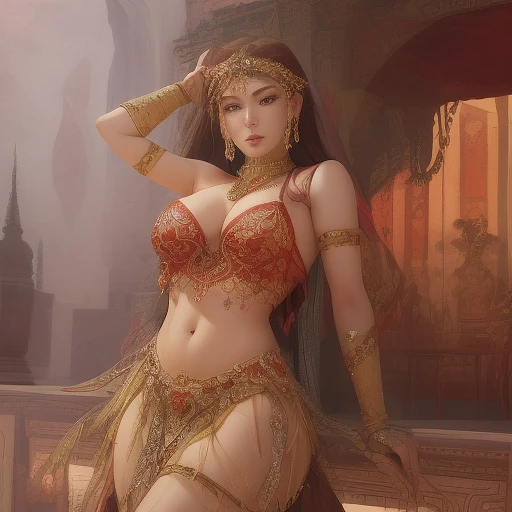 *Description* A breathtakingly detailed, hyper-realistic depiction of a gorgeous woman in a stunning red belly dancing outfit, adorned with intricate gold jewelry and a majestic forehead piece, accentuate her beauty, her stomach is taut and chiseled, standing seductively outside a serene desert temple in dance pit with ornate pillars. *Character Details* - Exquisite, photorealistic face with precise cosmetic features -Stunning, detailed eyes sparkling with vitality - Full, luscious lips - Flawless, radiant skin - lithe, taut chiseled stomach, DD breasts, accentuated by the fitted top and bottom. - waist length luscious, dark hair cascades beautifully around her. - wears a matching red skirt and bra, exuding an air of exotic elegance, both are adorned with gold accents, golden embroidery and green gemstones. - The skirt is split at the front, revealing her leg, is adorned with gold accents, gold embroidery, and green gemstones. *Attire and Accessories* - Gold jewelry, gold chains, wrist cuffs, upper arm coifs, belly button adornment, thigh bands, ankle cuffs, forehead piece and a gold band encircling her neck add a touch of luxury, elegance, beauty and mystery. - Intricate embroidery and patterns decorate the outfit along with green gemstones *Environment* - golden sunlight lighting creates an enchanting ambiance. - Outside a Fantasy desert temple background with ornate pillars, in a sand dance pit, ethereal, swirling clouds - Dramatic, cinematic lighting with soft, golden hues - Wide-angle perspective, emphasizing grandeur *Overall Mood* - The woman's pose and attire evoke a sense of mystery and allure. - Her confident stance suggests she is about to perform a mesmerizing dance. *Rendering Details* - 8K resolution with sharp focus - Hyper-realistic rendering with extreme details - Photorealistic textures and shading - Cinematic, high-contrast lighting