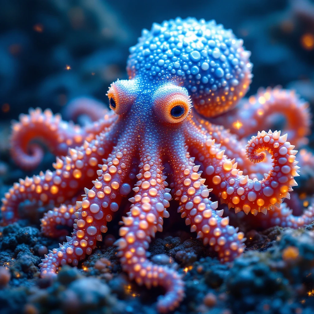 the image of a blue and white octopus, otherworldly, soggy, sparklecore, spiky mounds, puffy shine, i can't believe how beautiful this is, light orange and dark blue, magical