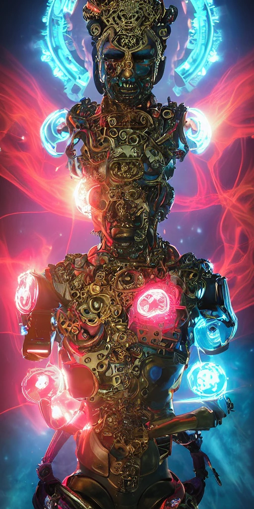 baroque and cyberpunk style full-body sculpture of a young seductive Hispanic prince half android with a chest exposing a glowing ruby battery, glowing pink seductive laser eyes, crown of blue gears and diamonds, swirling salmon-colored silk fabric, robotic raptors dinosaurs. baroque elements. full-length view. intricate artwork by caravaggio. art by Artgerm and Greg Rutkowski and Alphonse Mucha, Trending on artstation, cinematic industrial lighting, photorealistic, octane render, 8k, depth of field, 3D