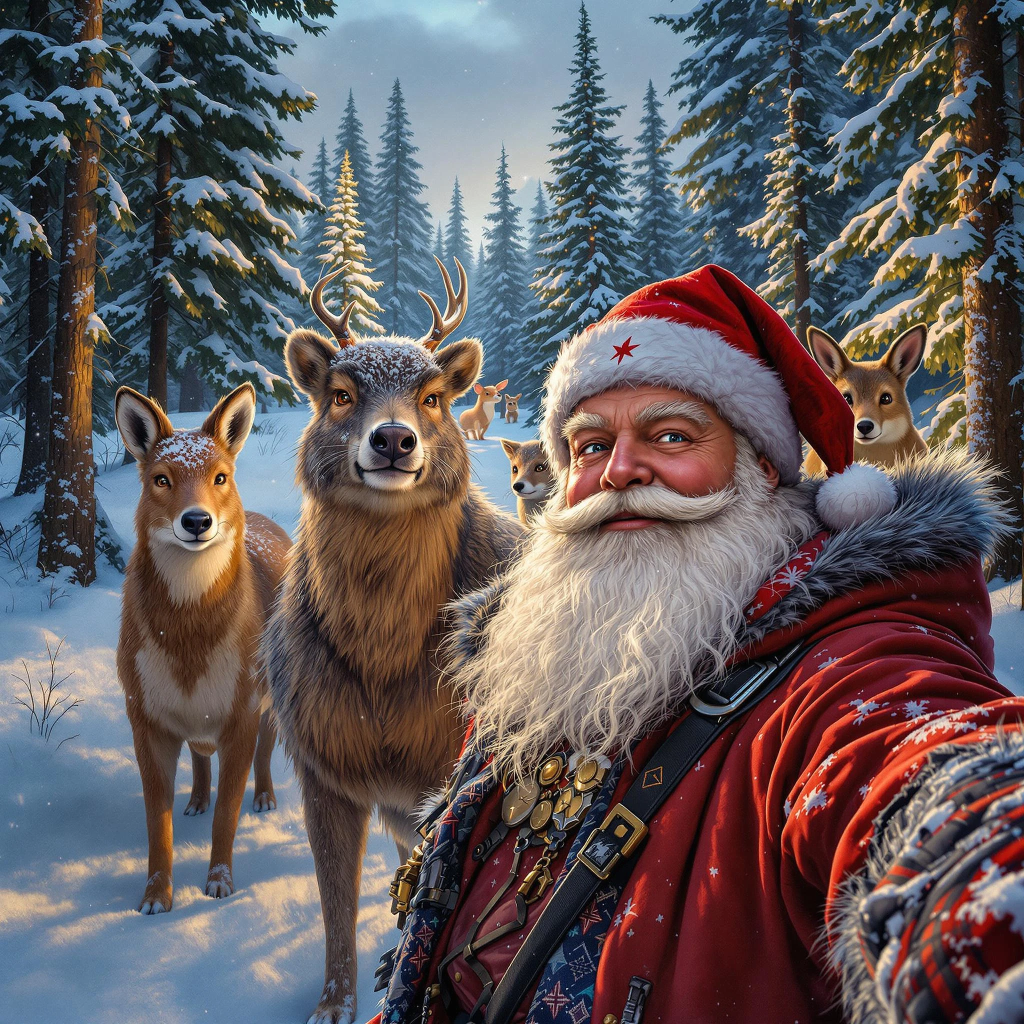 In the winter forest, there is an field with many forest animals standing on it. Santa Claus wearing a rocker jacket and hat takes a selfie in front of them, surrounded by more than five animals, in the evening, hyper detailed