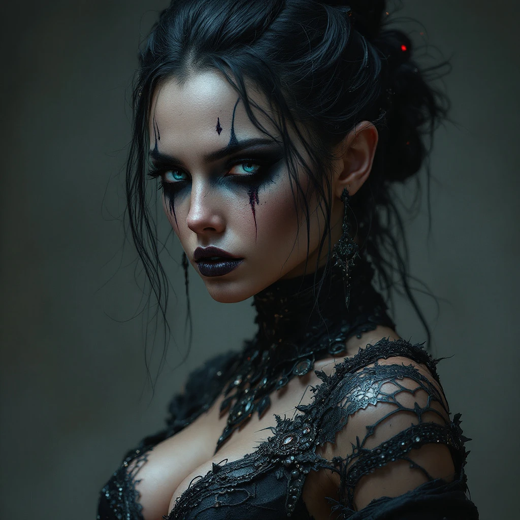 Design a photorealistic portrait of a woman with dark makeup and makeup art, set in a dark concept art style. Cowboy Shot, She is a gothic maiden shaman, blending dark fantasy with realism to create a hyperdetailed fantasy character. The portrait captures a cyberpunk angry gorgeous druid, with a fantasy concept art style. It depicts a female necromancer, influenced by Stefan Gesell's work, in a cyberpunk horror style. The dark fantasy character design should be in 4K concept art and hyper realism. Use detailed and vague sentences to emphasize the FLUX on her breasts, ensuring they are the central focus with intricate details and shadows.