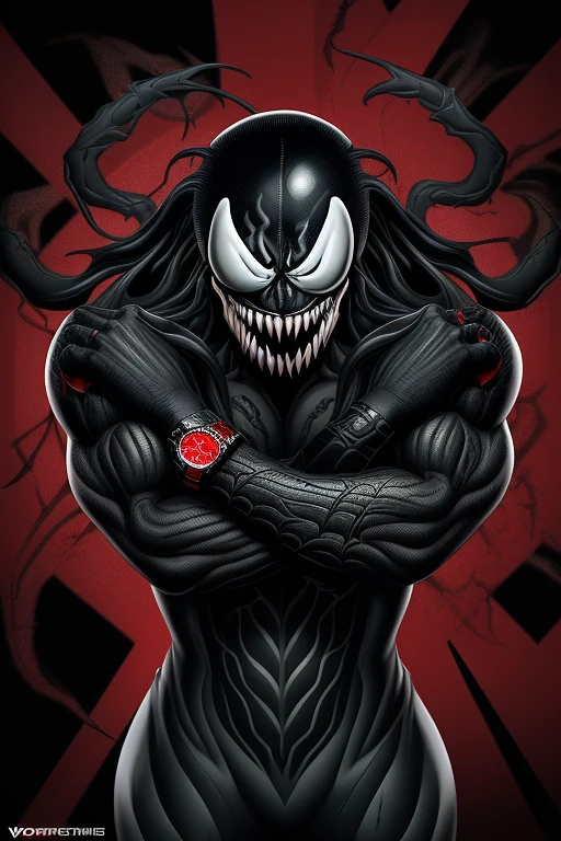 Venom but a watch with the design and character of Venom. The watch is Black and red, with the V logo on the front. The watch also has advanced features, such as the ability to fly, have super strength, and be bulletproof.