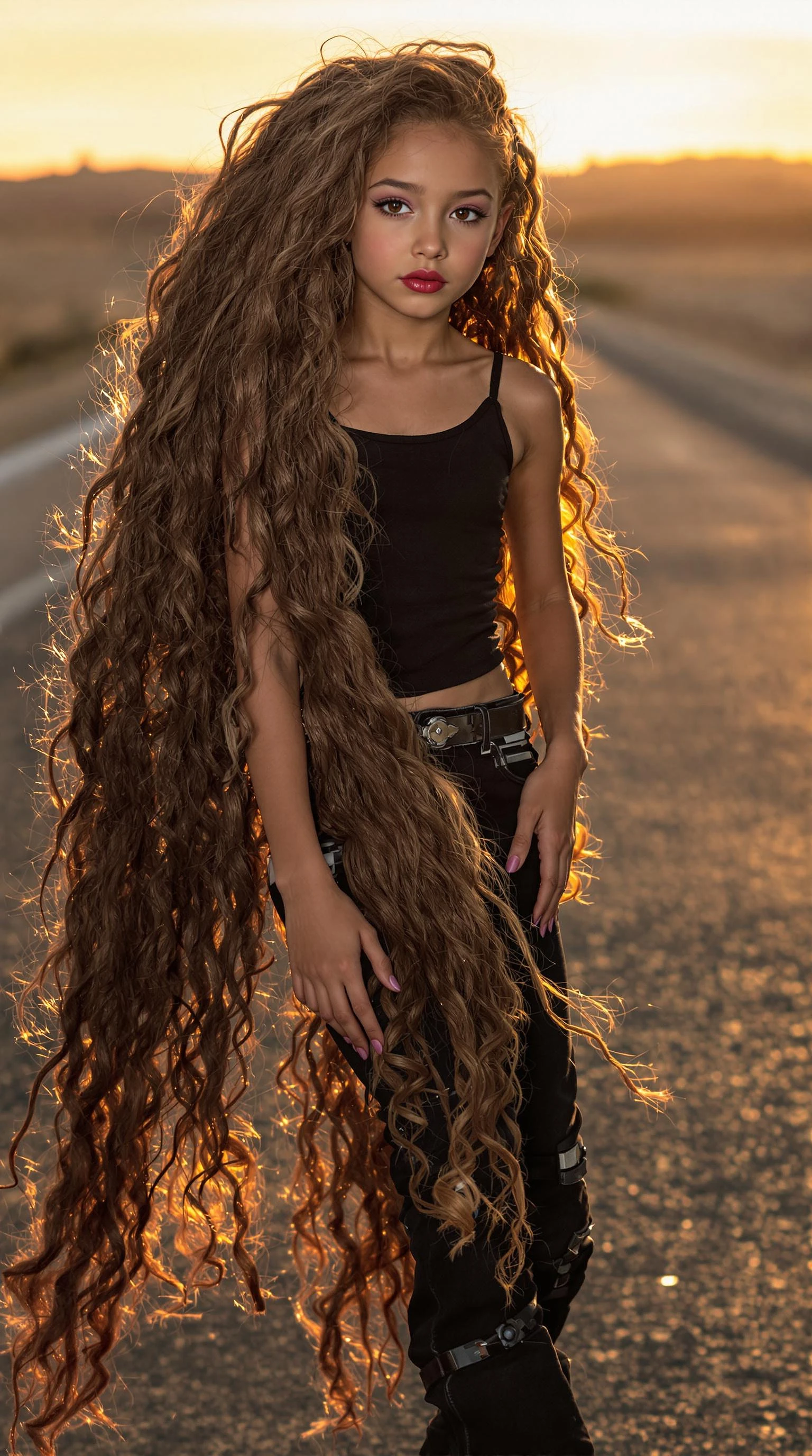 a professional photo of a exceptionally beautiful girl in the world (age 7) , (seven year old) , highly detailed, futuristic, (futuristic) , (masterpiece) , (realistic) , (perfect anatomy) , (Full body view) , (viewing from head to knees) with extremely long hair light brown curly hair, beautifully flawless olive skin, thick black eye liner, extra long eye lashes, light pink blush, extremely beautifully shaped lips with light red lipstick, light purple eye shadow, perfectly flawless olive skin, beautiful perfect high cheekbones beautiful perfect high cheekbones extremely detailed large perfectly shaped beautiful brilliant Forest Tea blue-brown-red-golden-grey-purple eyes, beautifully manicured fingernail with pink polish, (dressed in a black spaghetti strap tank top, black skinny jeans) , (in the style of mad max) , standing in a standing on a road, sun setting behind her, high depth of field, gentle expression, 8k, (high res) , ultra-detailed, photo-realistic, full image view, full body view, front view, highly detailed, volumetric, dramatic lighting