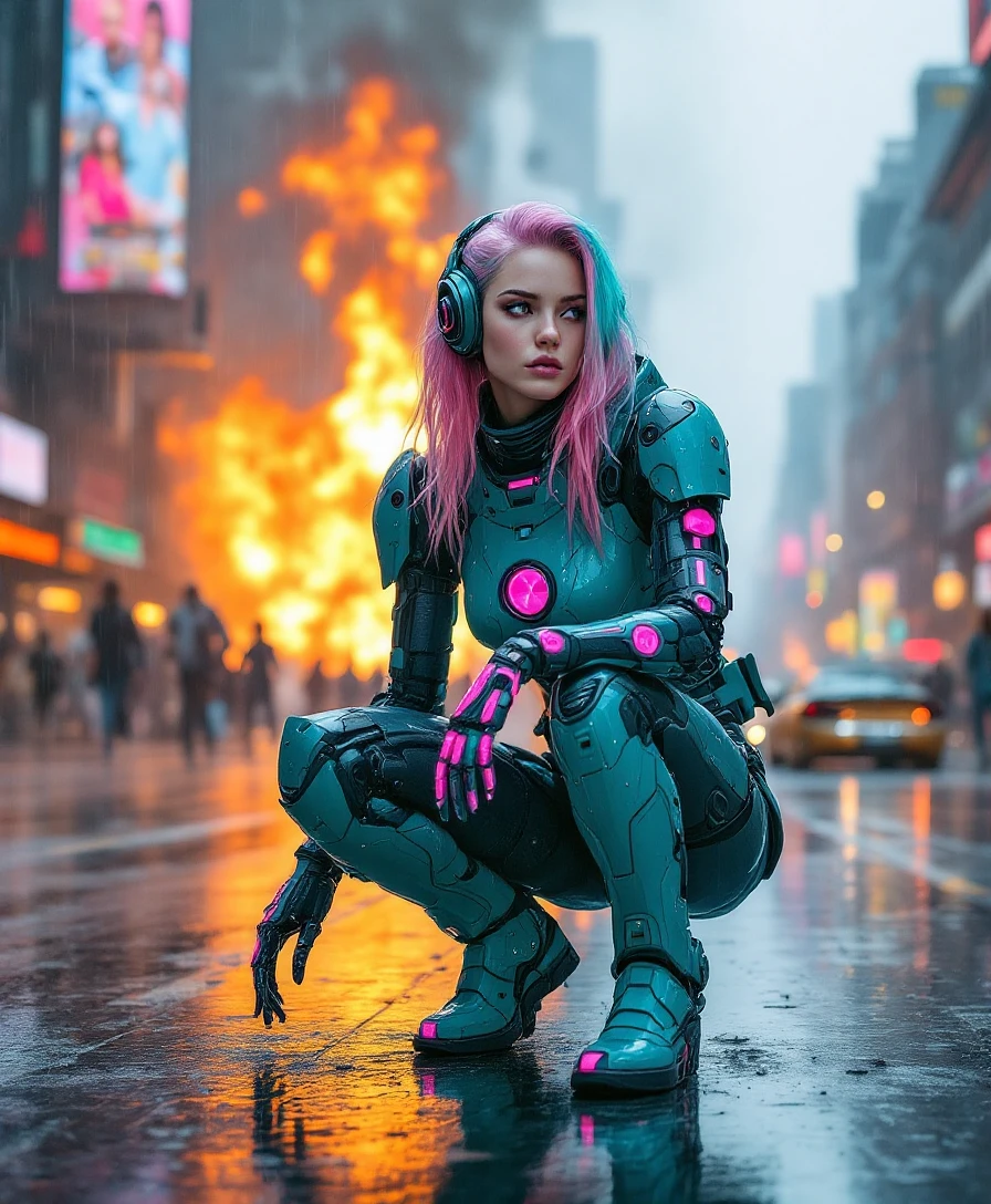 A beautiful masterpiece (8K) full-body portrait of a 20-year-old with pink and turquoise highlights in her hair. She is a cyborg. Her helmet is has different levels missing on her left side. Her armor is dark turquoise with pink colors that are pulsating throughout channels in her armor. The colors of her legs and feet are mismatched because of her replacement. She is slightly crouched, on the prowl as if she is hunting someone. It is pouring down rain in a dystopian, futuristic city with video boards and neon lights on the buildings. Behind her there are explosions of cars and buildings. There are other cars flipped over in the street on fire. People are running for their lives in the background. ultra high detail, extreme details.
