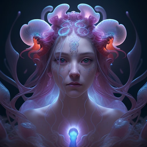Goddess close-up portrait ribcagel. jellyfish phoenix head, nautilus, orchid, skull, betta fish, bioluminiscent creatures, intricate artwork . octane render, trending on artstation, t symmetrical artwork. cinematic, hyper realism, high detail, octane render, 8k