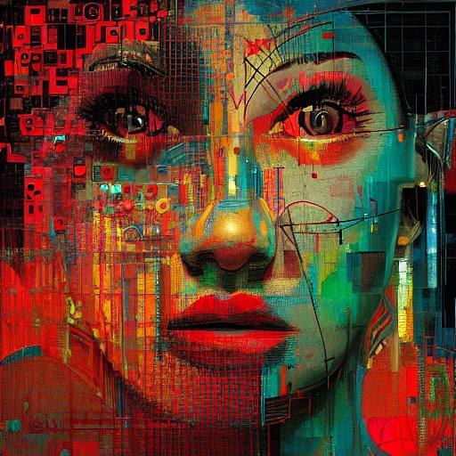 female musicAL, geometric abstract portrait, bright vibrant colorful, gritty, cybernetics, digital ui, abstract blocks, by Guy Denning, Russ Mills, chromatic, color blocking! , octane, object centered, oil on canvas, symmetrical, Red, concept art, abstract, trending on artstation, Pablo Picasso, Gustav Klimt, Jackson Pollock, trippy, high texture, --c 100 --s 1000 --ar 3:4 --style raw --q 2 --s 750