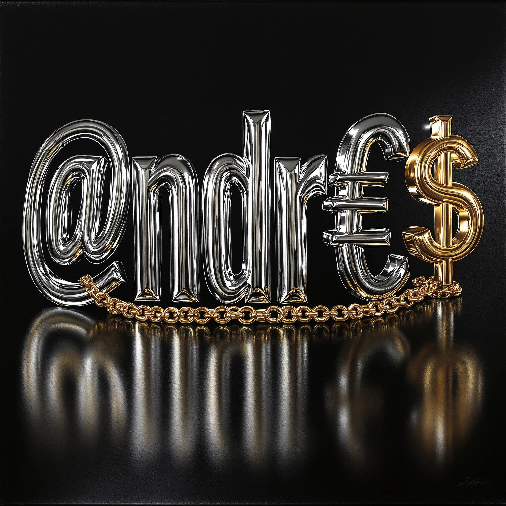 A hyperrealistic oil painting of the gleaming silver characters "@ndr€@" rendered in a metallic chrome finish against a sleek, polished black background with subtle reflections. Beside these characters appears a striking golden dollar sign "$" in luxurious gold leaf, creating the stage name "@ndr€@$". Beneath this name runs an opulent golden chain serving as an underline, with individual links catching the light and casting delicate shadows. The painting features meticulous attention to the play of light on metal surfaces, with highlights accentuating the dimensional quality of each character. The composition evokes the aesthetic of high-end jewelry and luxury branding, with photorealistic detail in the metallic textures and reflective properties.
