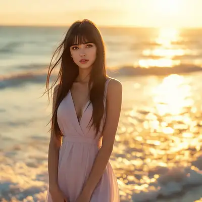 In the rays of the setting sun, a beautiful 19-year-old girl with long straight golden hair and bangs, dressed in an elegant swimsuit with a face painted in soft shades, stands boldly in a dynamic pose, at full height on the beach by the sea. Diffused rays of light and soft lighting play around her, creating an atmosphere of deep harmony around the image with the swaying sea in the background. A very realistic exterior photograph of a mid-century modern style house at eye level with ocean views, daylight, indirect lighting, advertising magazine, Frank Lloyd, Eames, Mies van der Rohe.
