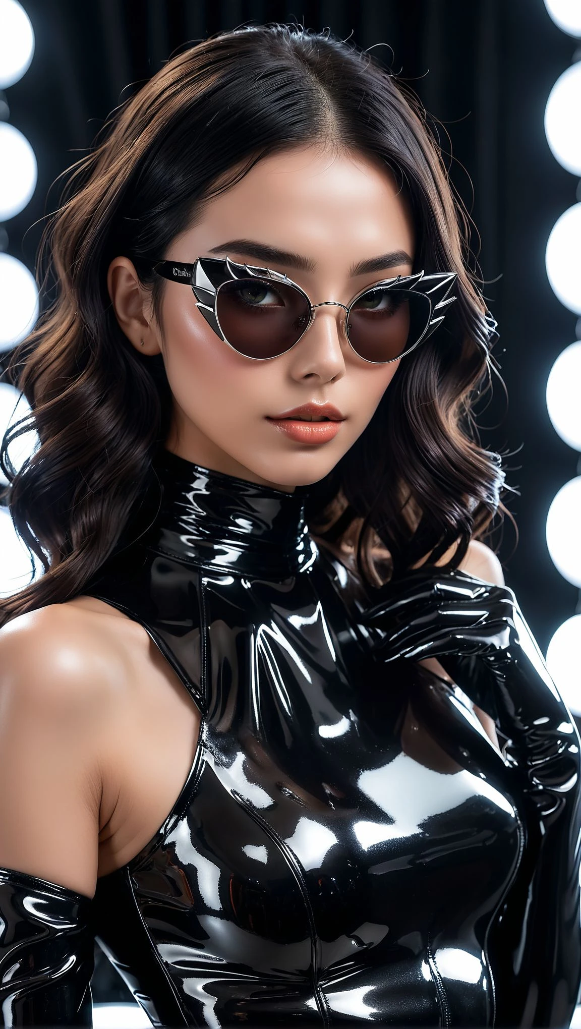 An avant-garde fashion ensemble sculpted from liquid-effect black latex, meticulously molded into a dramatic ruffled crop top with high-gloss undulating folds that catch and distort studio lighting, paired with a form-fitting fishtail skirt that flares into structured, fluid-like waves, the ultra-reflective surface creates a mirror-like sheen, amplifying depth and movement, accessorized with sleek opera gloves extending past the elbows, a high-shine patent leather choker with minimalist metallic accents, and fierce angular cat-eye sunglasses with a glossy black frame, cinematic lighting enhances the interplay of highlights and deep shadows, ultra-detailed textures capture the latex’s liquid tension and sculptural precision, evoking a futuristic yet high-fashion aesthetic infused with bold, avant-garde elegance