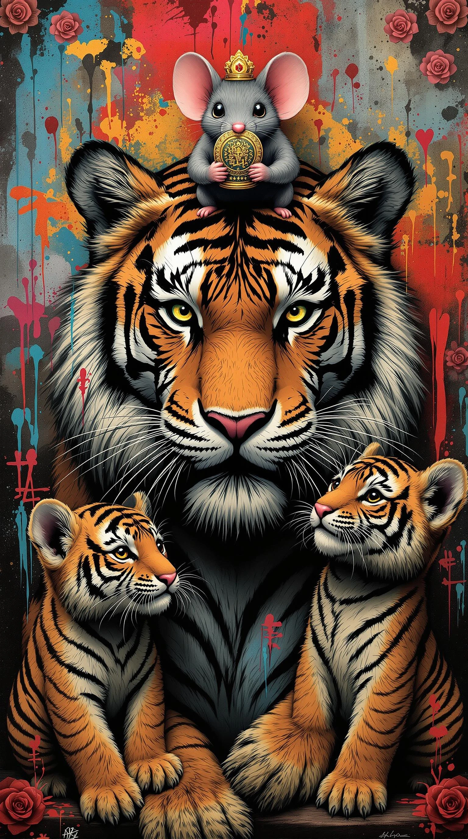 a tiger and two tiger cubs, and a oversized mouse , with a mouse on the tiger's head, the mouse holding a talisman, graffiti, POP MART