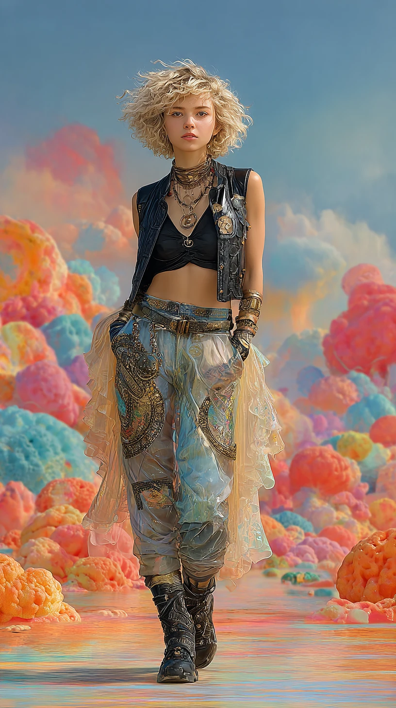 Full-length portrait of a French woman in an astropunk style, standing confidently on a futuristic beach. She wears a sleek, cyber-inspired outfit with metallic accents, translucent fabrics, and glowing elements. Her look blends retro-futurism with a rebellious edge — think space-age chic meets Riviera elegance. Her hair is stylishly tousled, with subtle neon highlights. The background features a surreal coastal landscape with shimmering water, alien flora, and a pastel-hued sky. Full body, adult woman, astropunk aesthetic, high detail, cinematic lighting