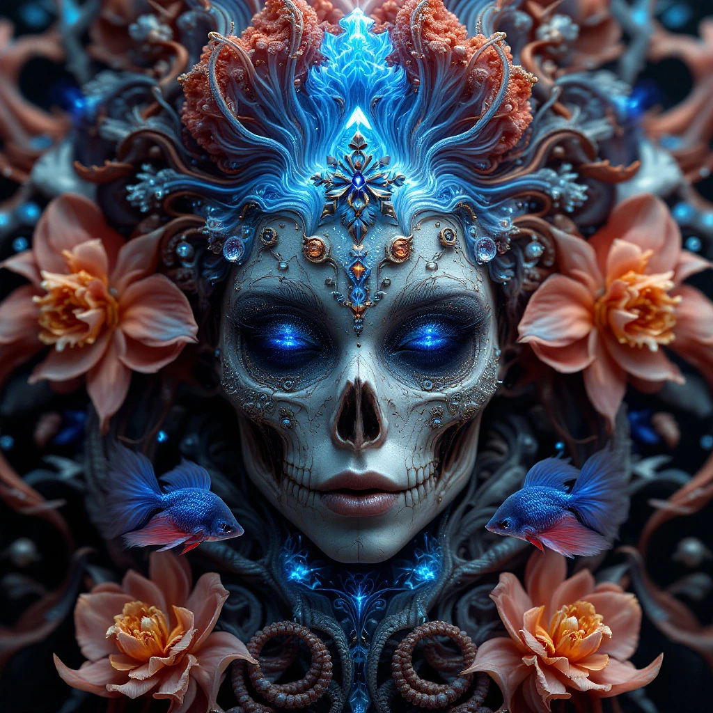 Goddess close-up portrait ribcagel. jellyfish phoenix head, nautilus, orchid, skull, betta fish, bioluminiscent creatures, intricate artwork . octane render, trending on artstation, t symmetrical artwork. cinematic, hyper realism, high detail, octane render, 8k