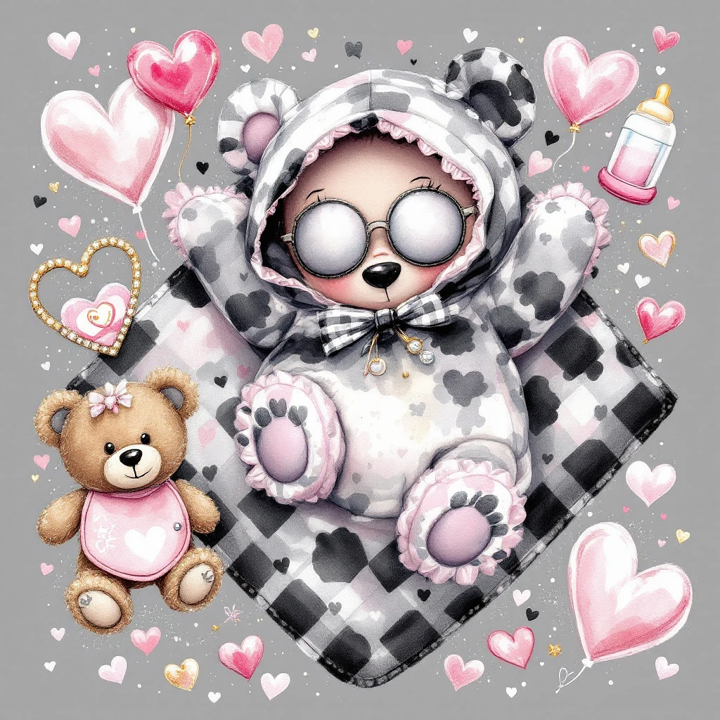 watercolor style chic bling glamours fabulous, cute raddle, pacifier, teddy bear, bottle. safety pin, bibb, pastel black metalic valentines heart patterns