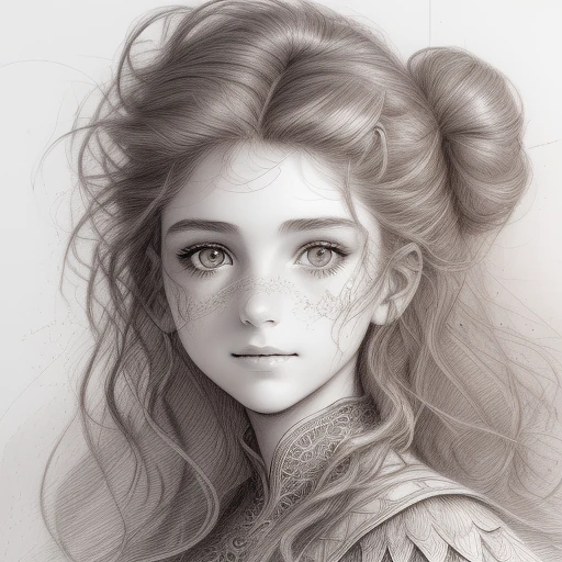A pencil and charcoal line sketch portrait, beautiful face of a young france girl, big brown sparkling eyes, slight smile, fantasy clothes, messy hairstyle, intricate details and precisely drawn cross-hatching lines throughout the drawing, bold lines