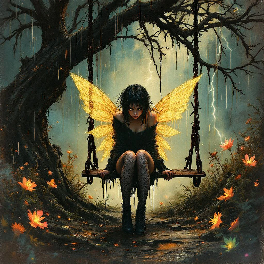 Fairypunk noir dreamscape: A defiant fairy crouches on a rusted swing beneath a dead tree, rain streaking her torn sweater and fishnets. Her glass-shattered wings glint with gold solder. Ghost-flowers glow in glitching colors scatter in storm winds. Twilight flickers with lightning and static, in a style of oil-slick ink and watercolor burns.