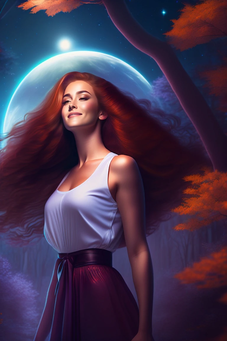A radiant young woman with auburn tresses, dancing in a starlit forest, illuminated by a full moon.
