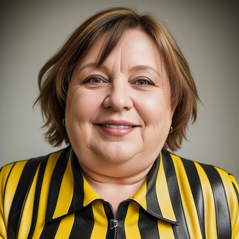 hyper realistic headshot photo of a 55 year old german woman, overweight, wearing a yellow black striped leather suit, looking into the camera smiling slightly