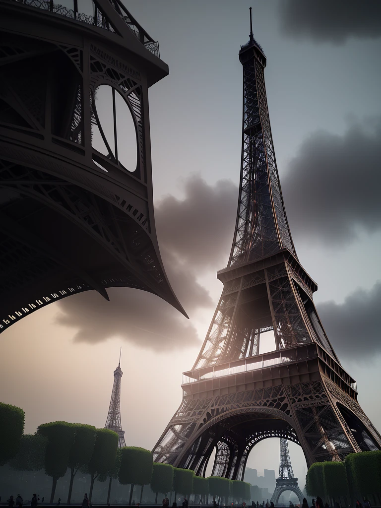 Photo of a ultra realistic Eiffel Tower, dramatic light, cinematic lighting, battered, low angle, trending on artstation, 4k, hyper realistic, focused, extreme details, unreal engine 5, cinematic, masterpiece, art by studio ghibli, intricate artwork by john william turner