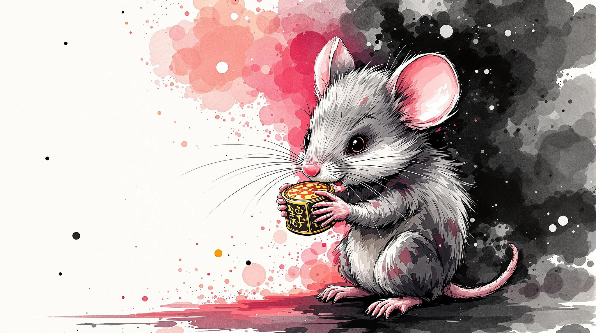 cute Mouse with straight face grabing a protective talisman, detailed, ink style, Ink splash art on the background, ink style, Ink wraps around the body, and the ink obscures the subject, exquisite,best quality, original, wallpaper, colorful, watercolor_ (medium) , covr, everyone, gradient_background,