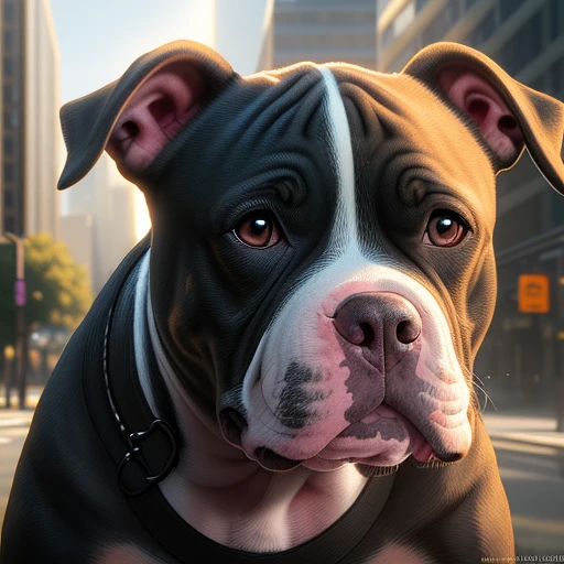 Zoomed in face adorable bully style pitbull pup in the city, closeup, ultra detailed, bright lighting, photorealistic, bright colors, volumetric rays of light, hdr. --9:16 Intricate artwork . octane render, trending on artstation, art symmetrical artwork. cinematic, hyper realism, high detail, octane render, 8k