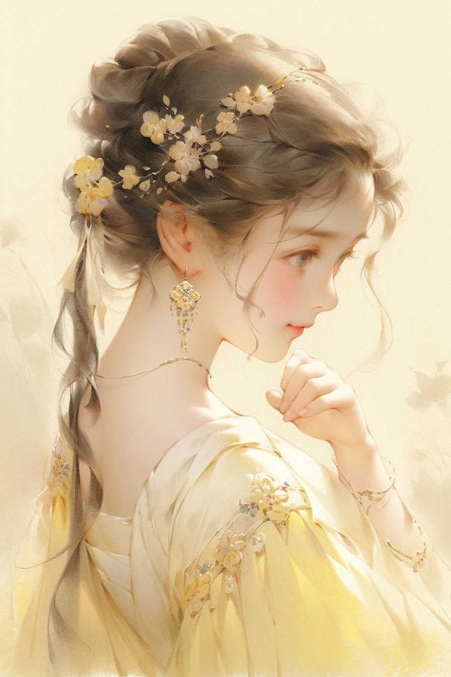 A beautiful pale yellow Tang Dynasty dress adorns a lovely young girl. The attire is adorned with exquisite details, reflecting the artistry and sophistication of the era. The soft and elegant hue of the dress complements the girl's appearance, adding a touch of radiance to her presence --ar 2:3 --niji 5 --s 1000