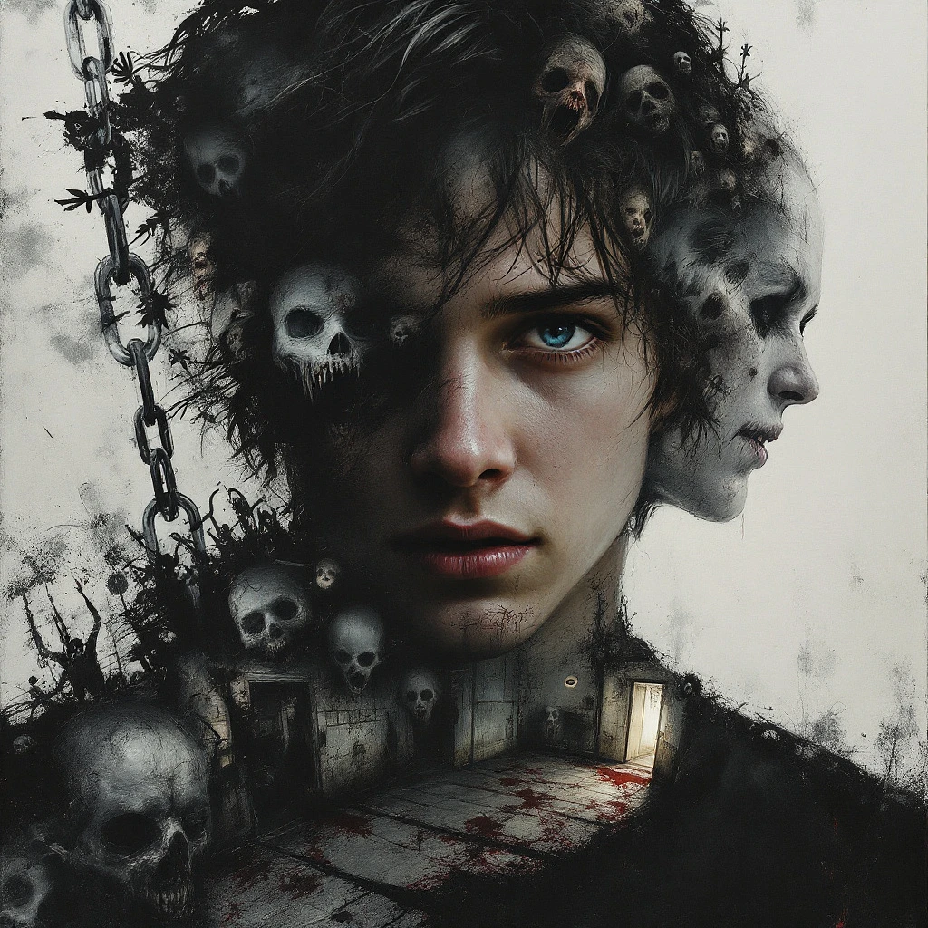"An award-winning, harrowing double exposure oil painting that captures the sinister and macabre atmosphere of Hostel. The central figure is a young traveler, their face a haunting mix of fear, disbelief, and desperation as they slowly realize the horrors unfolding around them. Their image blends with the disturbing, nightmarish surroundings of the foreign hostel—dimly lit hallways, locked doors, and the shadowy, unfeeling faces of their captors lurking in the background. The double exposure technique seamlessly merges the figure with the grotesque and macabre imagery of the torture chambers, with ominous tools of pain, bloodstained floors, and dark silhouettes of twisted figures in the background, all becoming part of the character’s form. The tension is palpable as the traveler’s body dissolves into the cruel, unrelenting environment, their limbs intertwining with the dilapidated walls, chains, and eerie shadows. The palette is dominated by dark, foreboding tones—grays, blacks, and muted reds—accentuated by the occasional, sickly yellow light from the flickering lamps, heightening the sense of dread and isolation. The texture of the oil paint intensifies the claustrophobic atmosphere, with thick brushstrokes creating depth and tension, as every element of the painting seems to close in on the viewer. The composition blends the vulnerability of the protagonist with the inescapable terror of the environment, conveying the chilling theme of being trapped in a foreign, cruel world where one’s worst fears come to life. This masterpiece is a visceral exploration of human terror, survival, and the grotesque, making it a darkly captivating and emotionally charged portrayal of the horrors from Hostel.