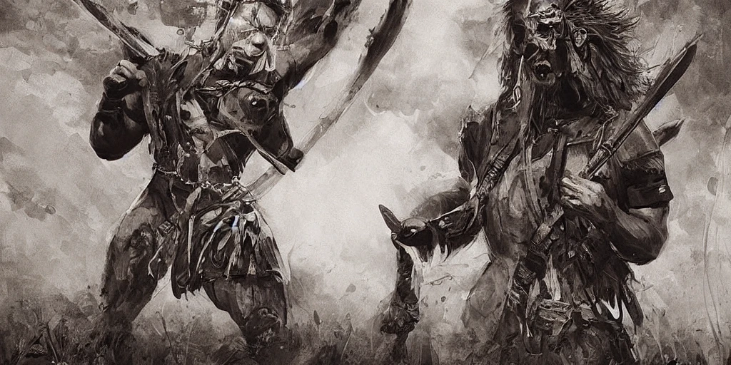 A close up of the The wrestler Cobra Jeff Farmer portrait photo and A pose, male, warrior, shield in hand, spear in hand, place of battle, swords stuck in the ground, skulls on the ground, detailed illustration, digital art, overdetailed art, concept art, full character, character concept, long hair, full body shot, Dan Mumford, Peter Mohrbacher, Greg Rutkowski, fantasy character, detailed illustration, hd, 4k, digital art, overdetailed art, concept art, trending on artstation